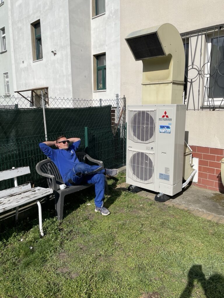Einblick in die Montage: Präzision und kurze Pausen Das Foto entstand während der finalen Montagephase. Es zeigt unseren Senior-Techniker, [Name], der kurz Kraft tankt. Bei solch komplexen Integrationen im Bestand ist höchste Konzentration gefragt. Die Anbindung an die Regelungstechnik des Bestands erfordert Erfahrung und Fachwissen. „In der Ruhe liegt die Kraft“, sagt [Name] und genießt einen Moment die Sonne, bevor er die Anlage final einreguliert. Dieser sympathische Moment zeigt: Wir sind stolz auf unsere Arbeit und unser Team.